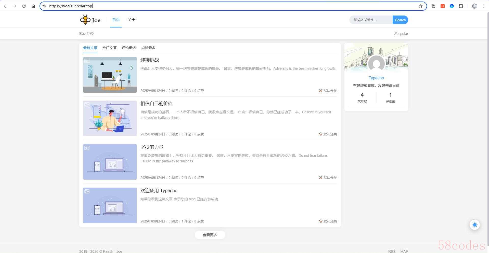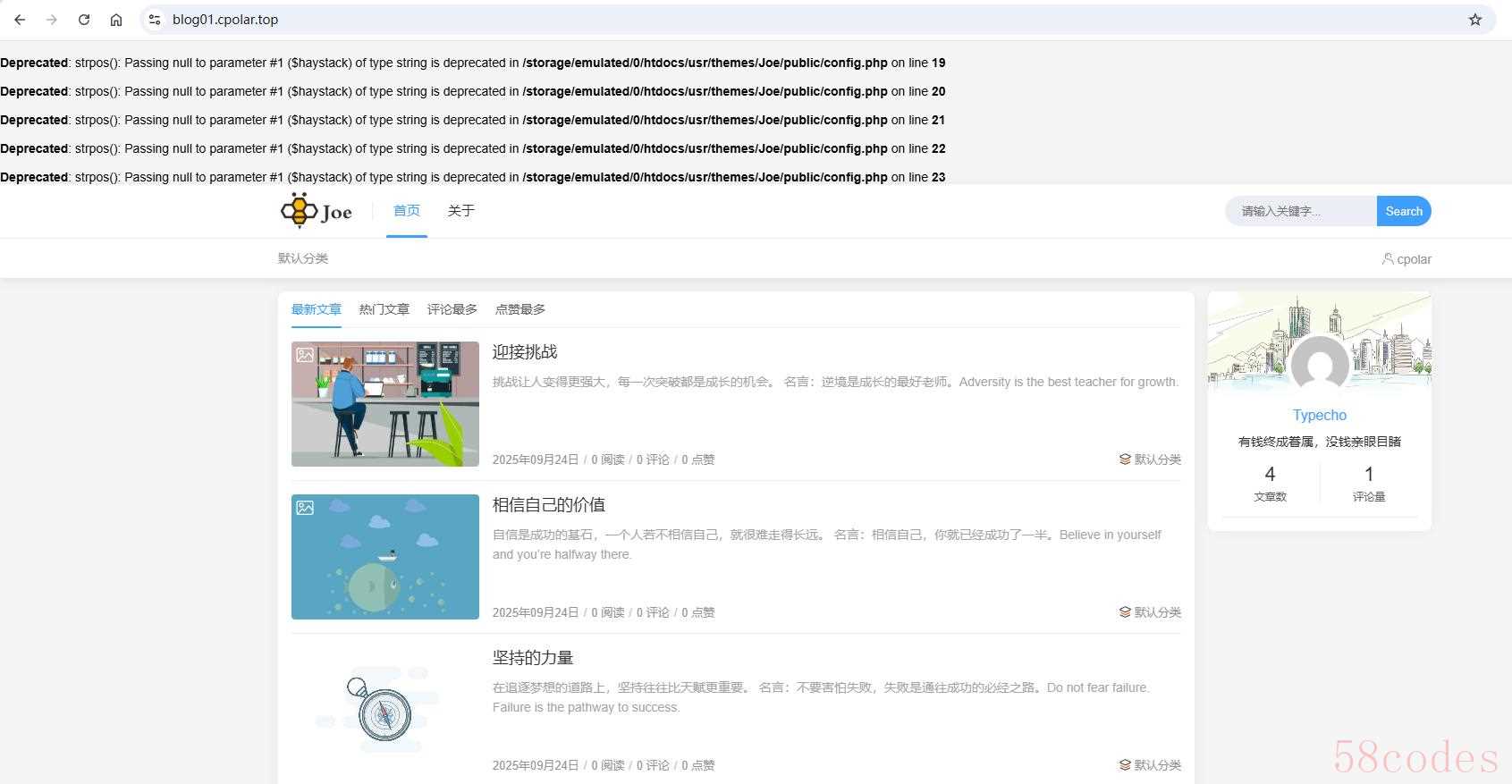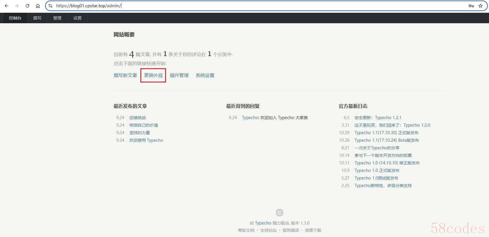 可以看到,左上角已切换为我们保留的固定二级子域名,访问也更加稳定可控。至此,从本地环境搭建、数据库配置,到内网穿透与固定域名绑定,整套“旧手机变服务器”的核心流程已经跑通。接下来,我们就来为站点挑选一款合适的主题,并完成基础个性化设置,让你的 Typecho 博客既好用也好看。