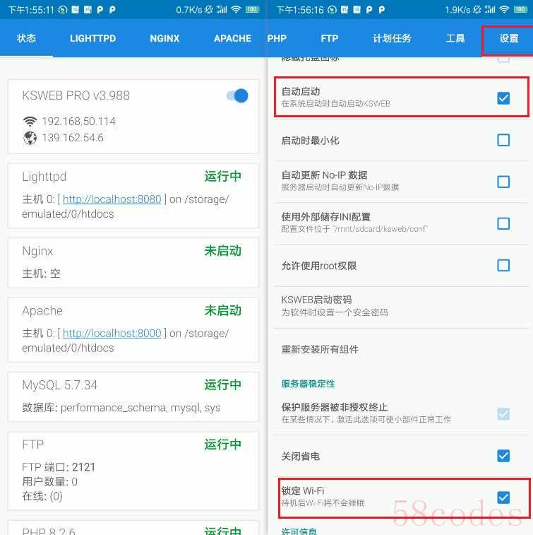 打开KSWEB应用,首次进入能够看到在快速安装,然后来到设置,启用自动启动和锁定WIFI:
