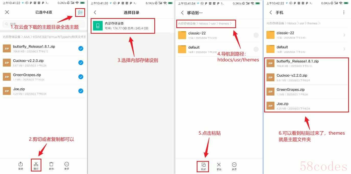 4. "解压安装包":使用文件管理器找到 Typecho 安装包,并解压到 `/sdcard/` 目录下。