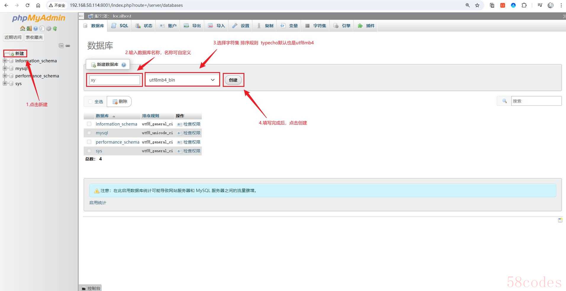 登录进来后,点击新建按钮,然后输入数据库名称(名称自定义即可),以及选择字符集和排序规则,这里设置的数据库名称为xy,字符集选择utf8mb4_bin,然后点击创建按钮进行创建数据库: