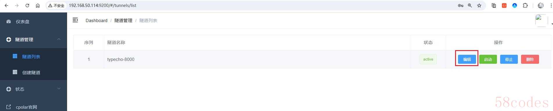 接着,进入侧边菜单栏的隧道管理下的隧道列表,可以看到名为typecho-8000的隧道,点击编辑按钮进入编辑页面: