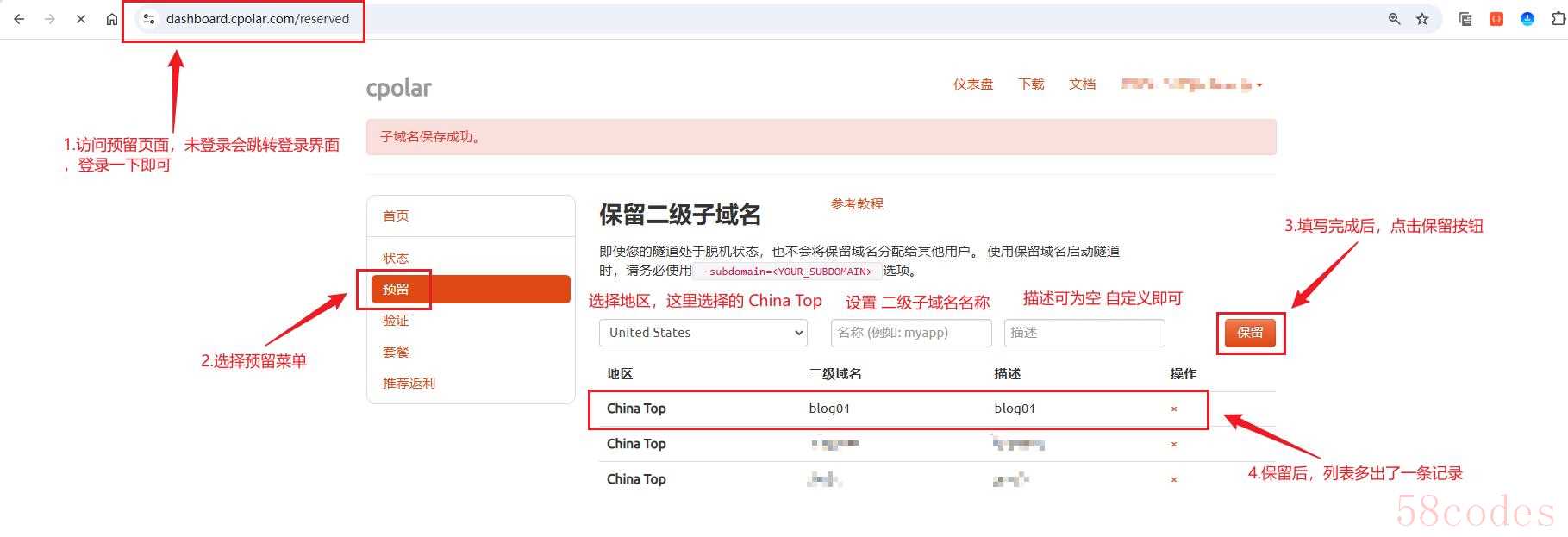 选择预留菜单,即可看到保留二级子域名项,填写其中的地区、名称、描述(可不填)项,然后点击保留按钮,操作步骤图如下: