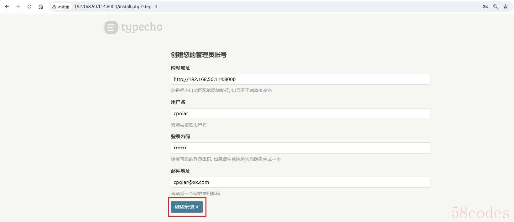 配置完成后,点击确认,开始安装,进入到创建您的管理员账号页面,设置一个您要用来登录Typecho博客网站的账号:
