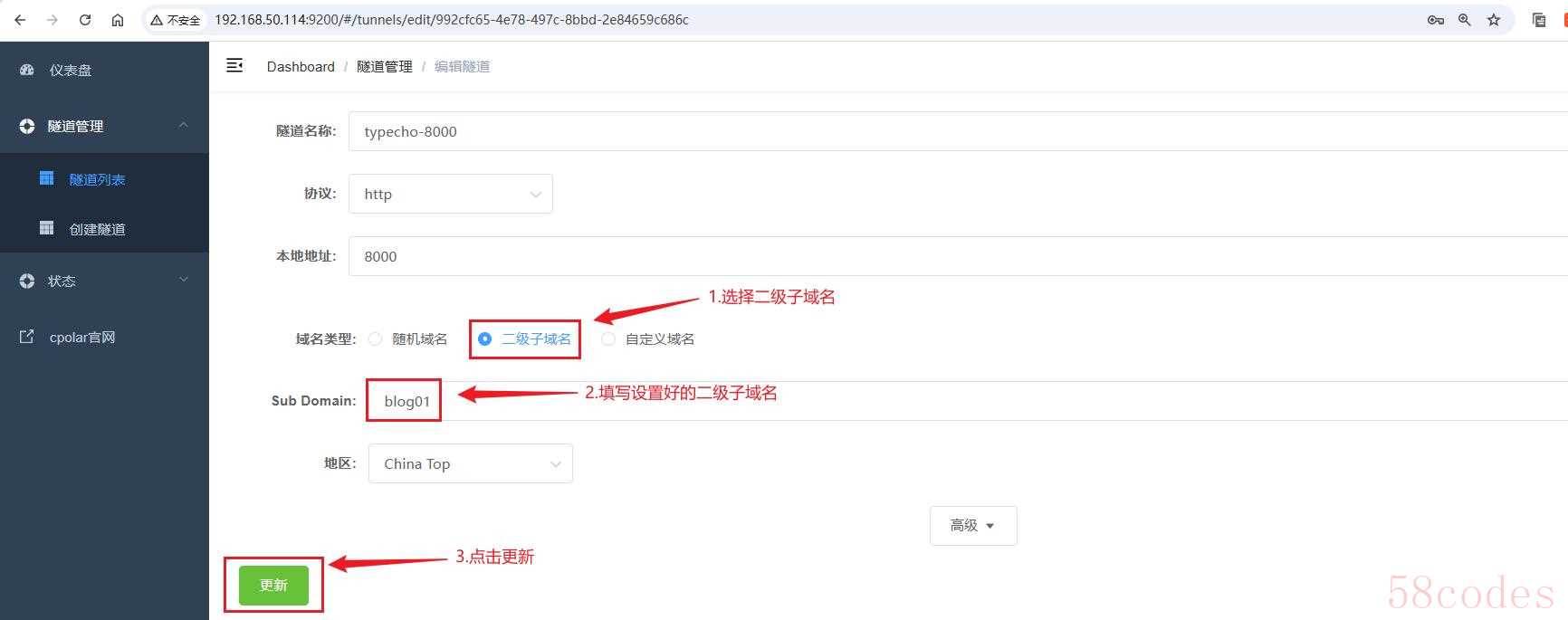 修改域名类型为二级子域名,然后填写前面配置好的子域名,点击更新按钮: