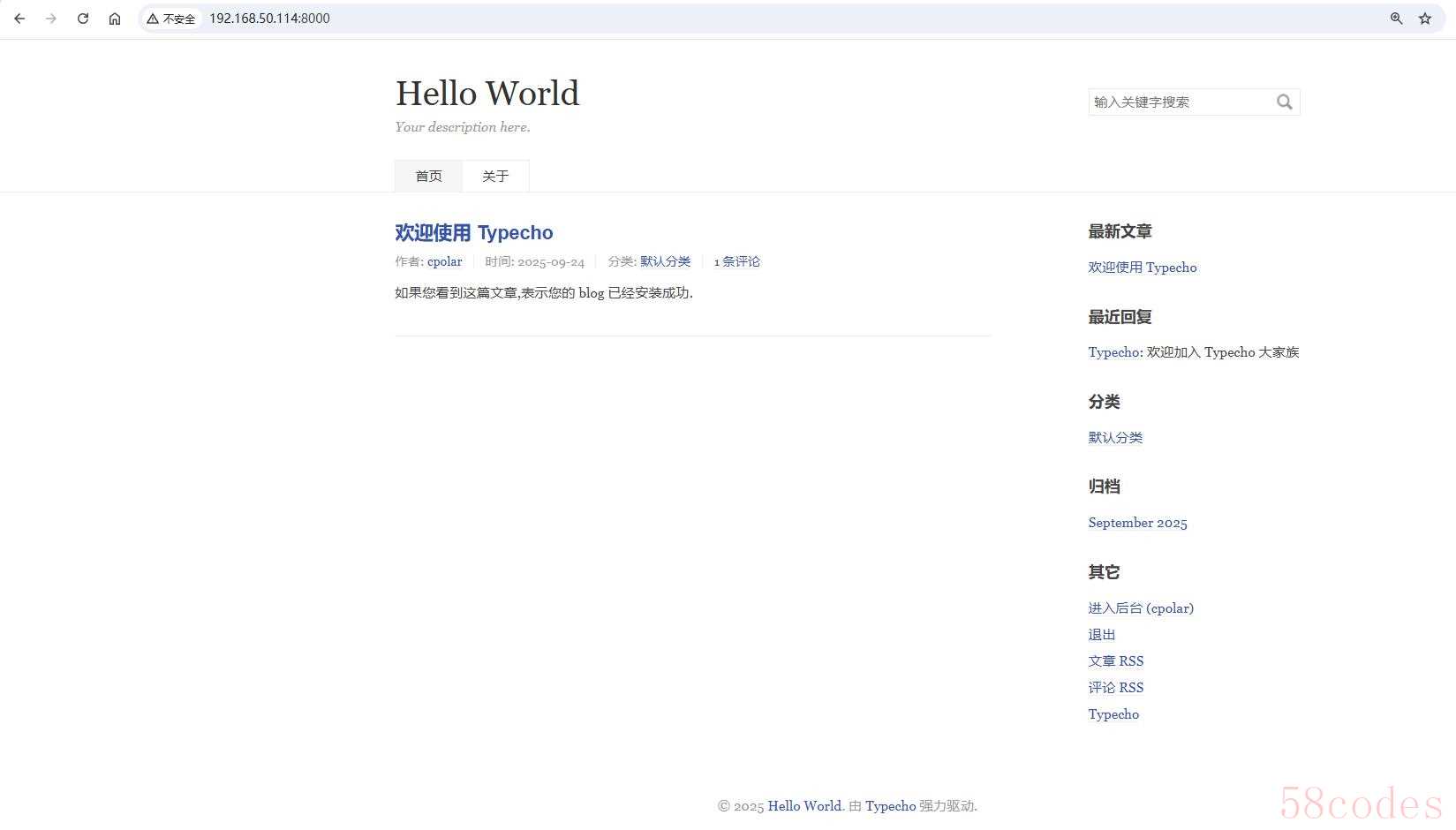 可以看到,安装完成后,提示了您的账号信息,然后接下来,直接访问Typecho的首页: