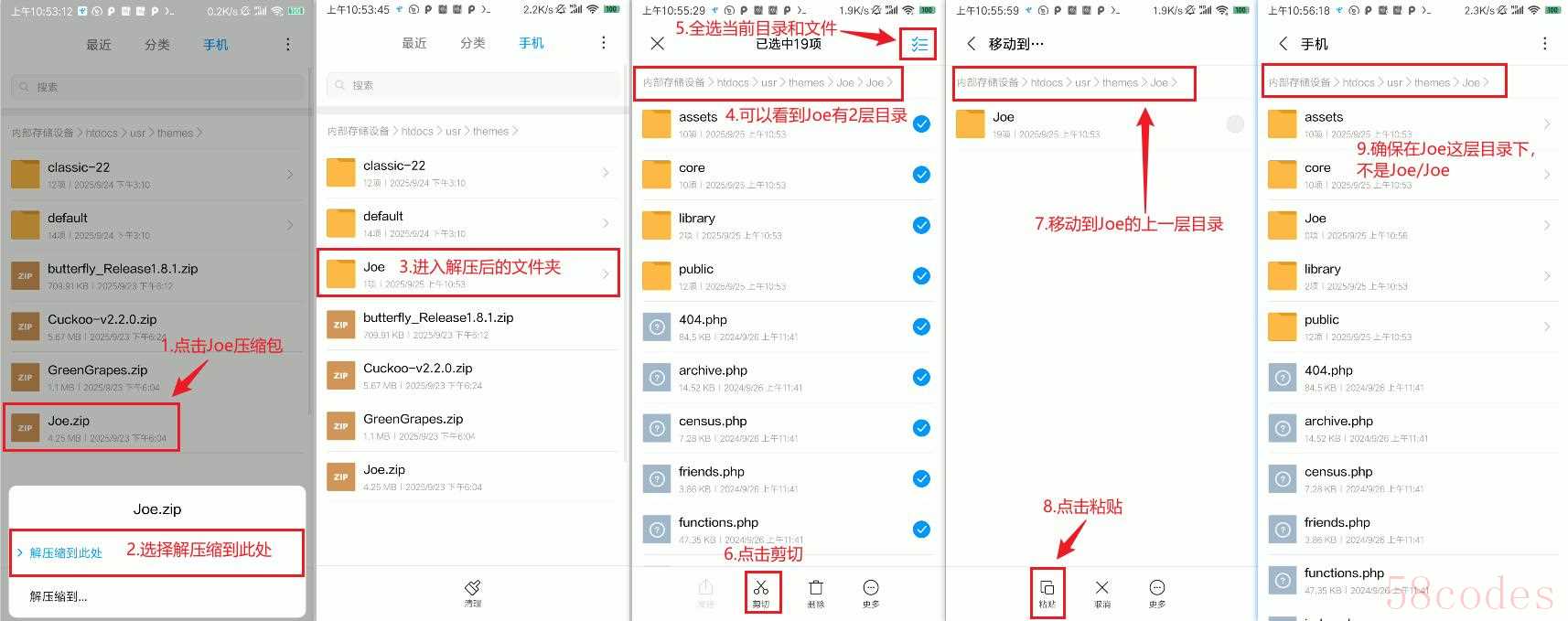 将主题移动过来后,解压Joe主题,解压后会有2层Joe目录,并且将Joe主题移动到上一层Joe目录: