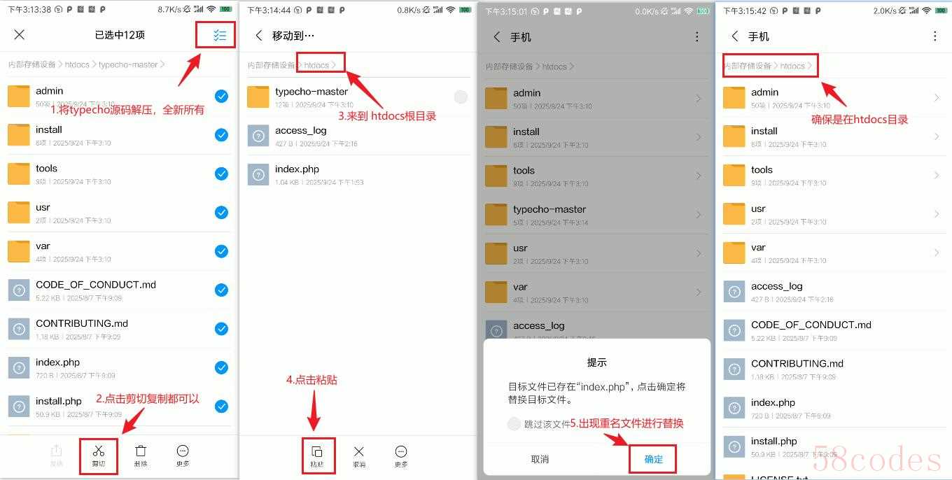 首先,我们将Typecho的源码压缩包解压, 然后将源码目录下的所有文件复制到手机的htdocs目录,如下图: