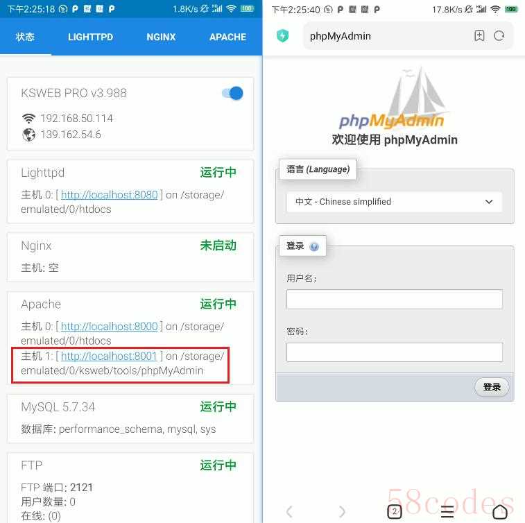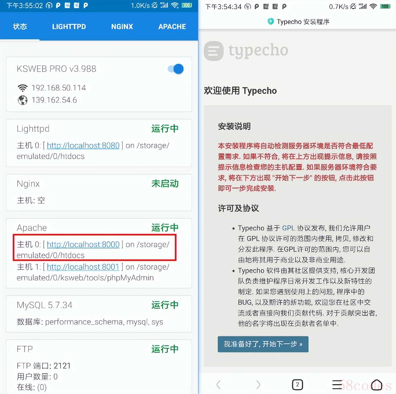 为了方便演示,这里修改Apache的IP从localhost改为0.0.0.0,这样修改后,局域网的设备也可以访问该设备IP的博客,从KSWEB的状态页可以看到,手上这台Mix2s的设备局域网IP为192.168.50.114(注意:每个人的设备IP都不一样),接着在局域网的电脑浏览器中访问测试:
