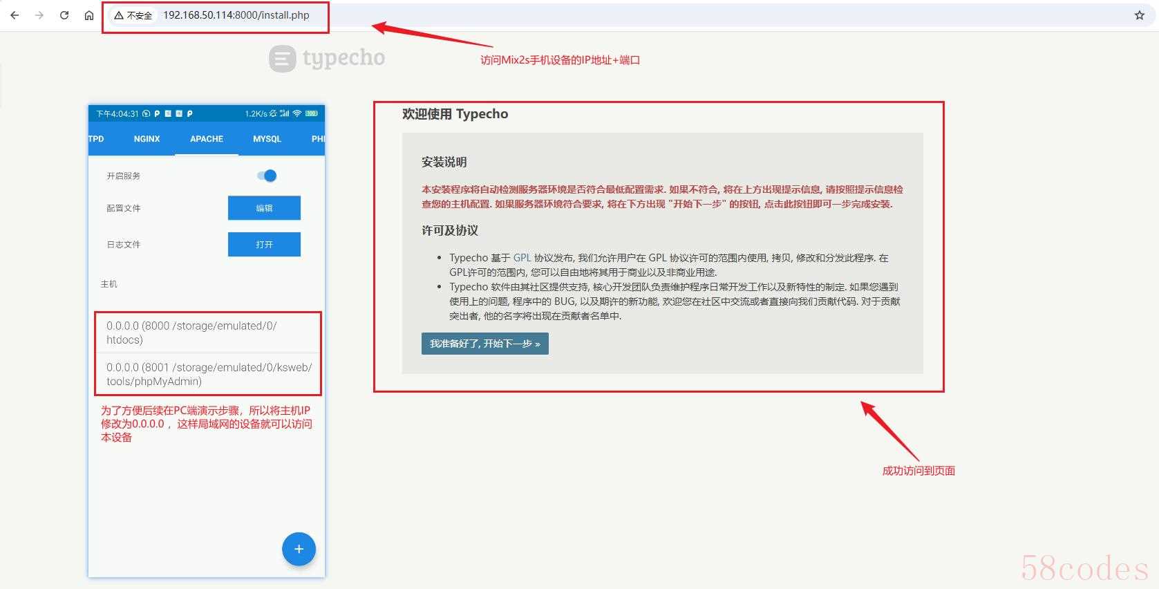 - 核心流程:KSWEB 搭建 LAMP → Typecho 初始化 → 局域网验证