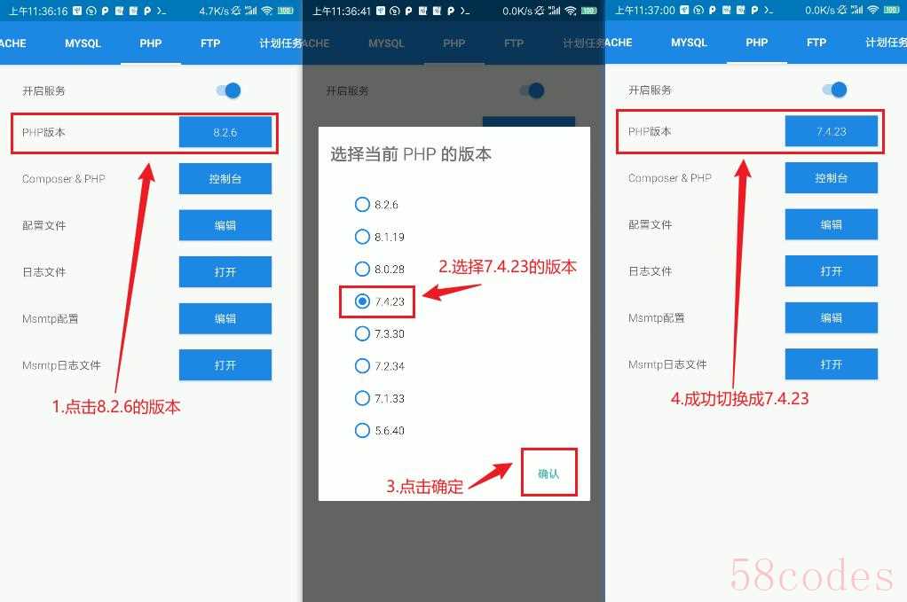 这个原因是因为KSWEB默认安装的PHP版本是最新的8.2.6,然而Joe主题推荐使用的版本是PHP7.4的版本,所以需要更改一下版本即可,其他主题7.4的版本同样适用: