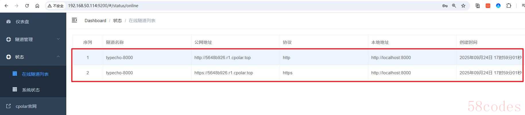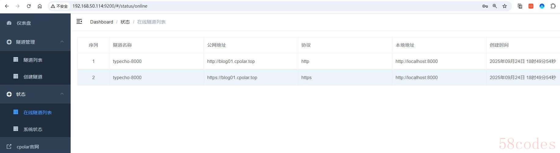 来到状态菜单下的在线隧道列表可以看到隧道名称为typecho-8000的公网地址已经变更为二级子域名+固定域名主体及后缀的形式了: