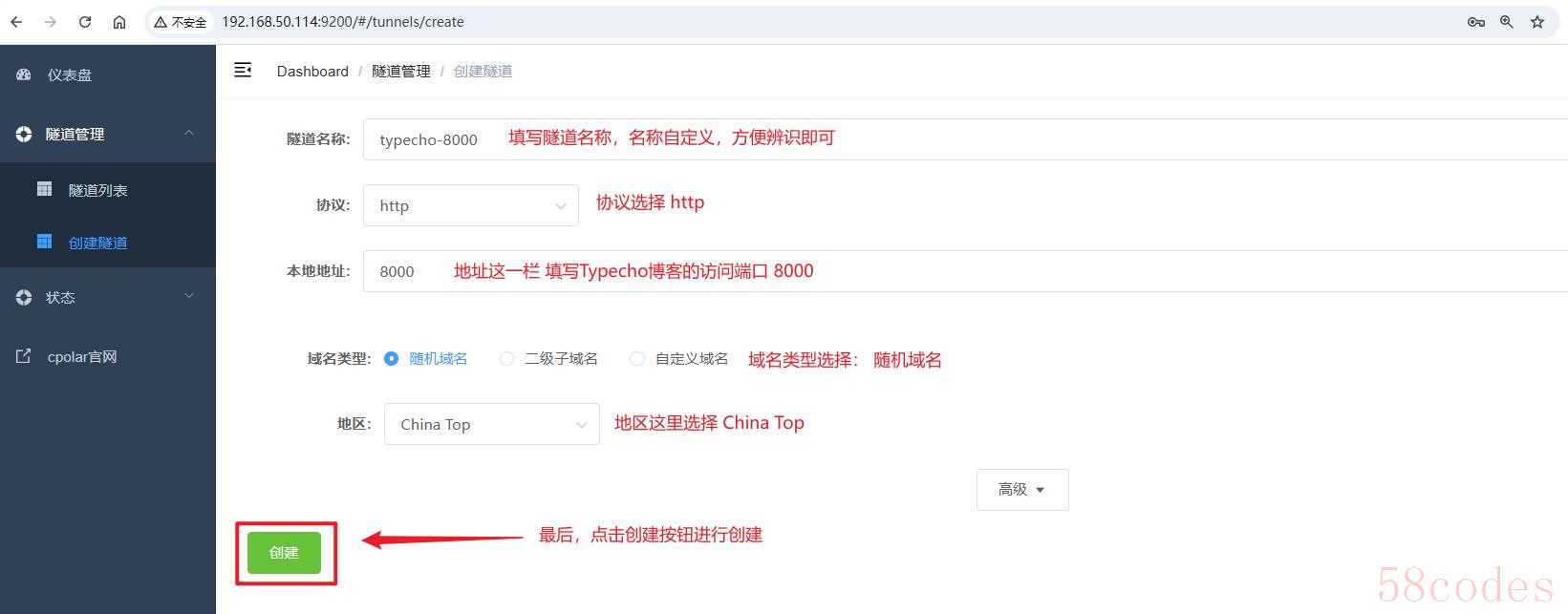 点击左侧菜单栏的隧道管理,然后点击创建隧道,填写相关的隧道信息,如下图: