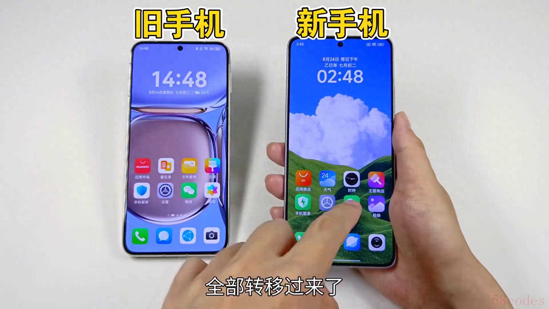 →到了这一步第一步就完成了。现在这个是旧手机,这个是新手机,新手机这里显示一个登录,大家记住这个登录先不要点,点了之后新手机就自动登录微信了,还得用旧手机登录回,多操作一步。所以到了这一步登录这里千万不要点。