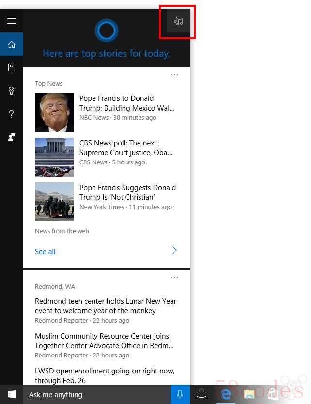 Cortana 语音助手搜索音乐更简单了:微软在 Cortana 界面的右上角加入了一个音乐搜索的按钮,通过点击该按钮,小娜便进入监听状态,识别你正在播放的歌曲,并为你搜索出相关的网络结果来。