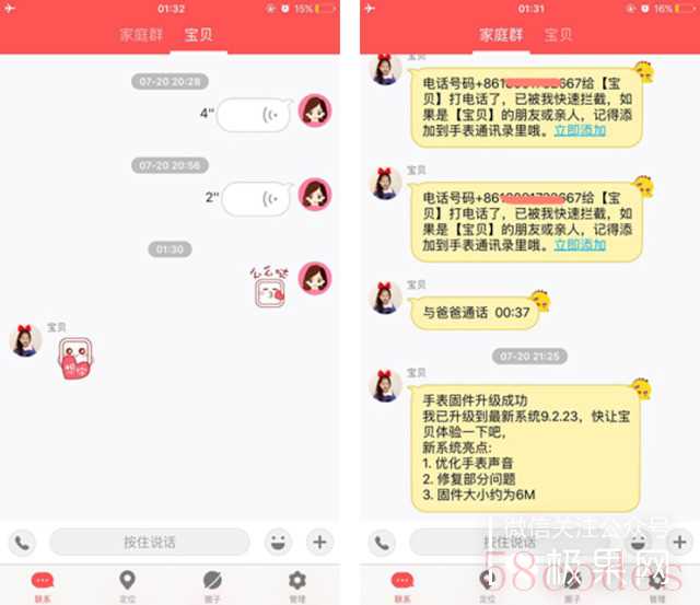 联系界面分家庭群组聊天和宝贝私聊界面,互动非常有爱。定位界面采用瑞士u-blox定位芯片,运用gps,wifi,基站重力感应四重定位技术,精确定位,15s刷新一次,时时汇报位置,右上角还会显示宝贝手表的即时电池电量。圈子功能则像一个巴比龙大家庭,提供各种产品信息,家庭教育,健康指南,线上活动等动态新闻,这些信息对家长来说温暖又实用。