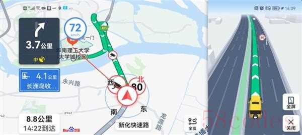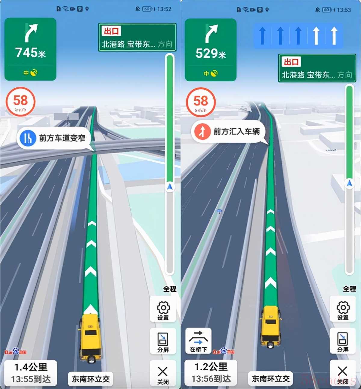 此外,百度地图车道级导航也更加精细化,支持地面车信、限速、方向看板等元素呈现,实现行车线、地面道路配色、高速护栏、道路隔离等全量要素的视觉效果升级,帮助用户一目了然地获取道路信息,可谓“所见即所得”。