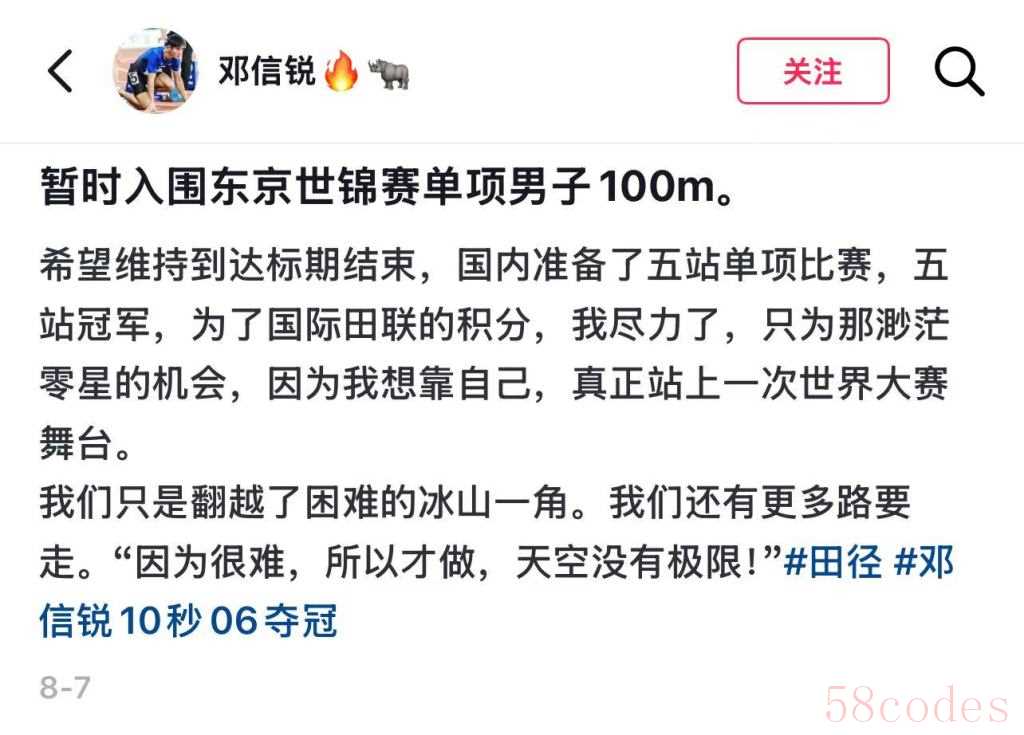 在赢下全国锦标赛男子百米金牌之后,邓信锐在自己的社交账号上写下这段激励自己的话。