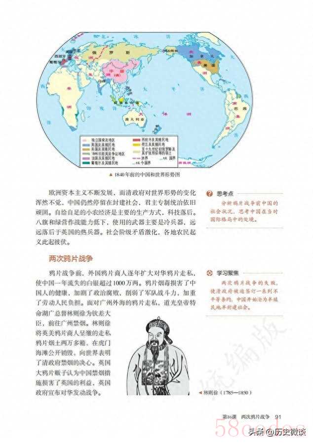 首先,从我们最早接触鸦片战争这个名词的历史课本讲起。在2019年的人教版高一历史必修、中外历史纲要教科书中,用了190个字讲述了战争爆发的原因。简单说就是,外国商人用鸦片荼毒大清子民,清廷命林则徐进行虎门销烟,英国政府以此为由,对华发动了侵略战争。
