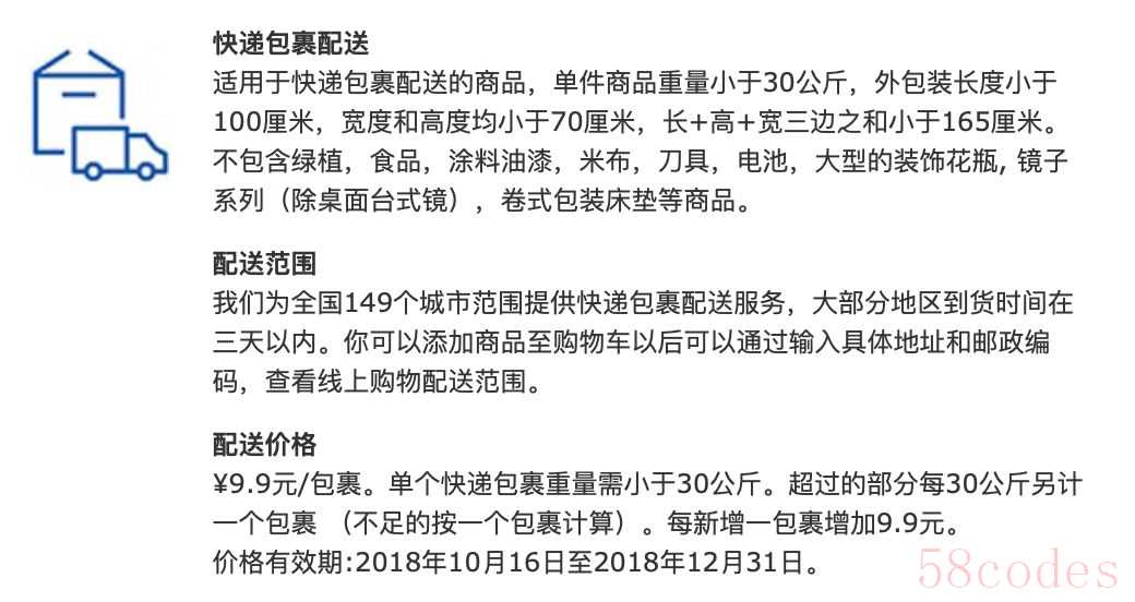 既然开启了网购邮费必然是大家关心的问题之一,对于快递的收费宜家实行小件9.9元起,大件69元起,只要单件商品重量低于30公斤,外体积不过大,运费都是9.9元