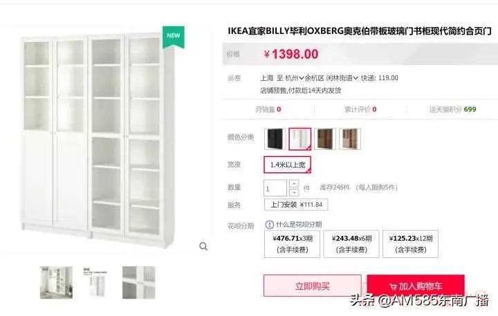 还有安装呢?毕竟要是买柜子的话,自己装装是很麻烦的。我随机选了个带玻璃门的书柜,1398元,页面显示可以选择上门安装服务,预计收费111.84元。