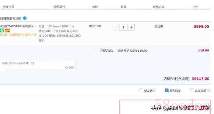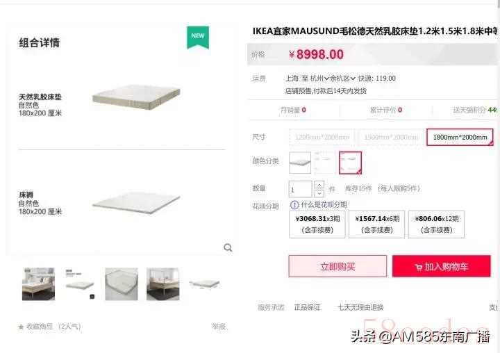 这个天然乳胶床垫,是宜家床垫里最贵的了,1.8米乘2米的,要8998元。产品标注是上海发货,送到杭州余杭区,运费是119元。