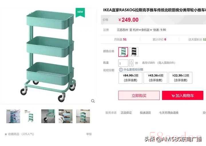 再来看小件,我找了宜家的“网红”小推车,我家里已经有一个乳白色的,非常好用。小推车价格249元,运费9.9元,属于可以快递配送的小件商品。