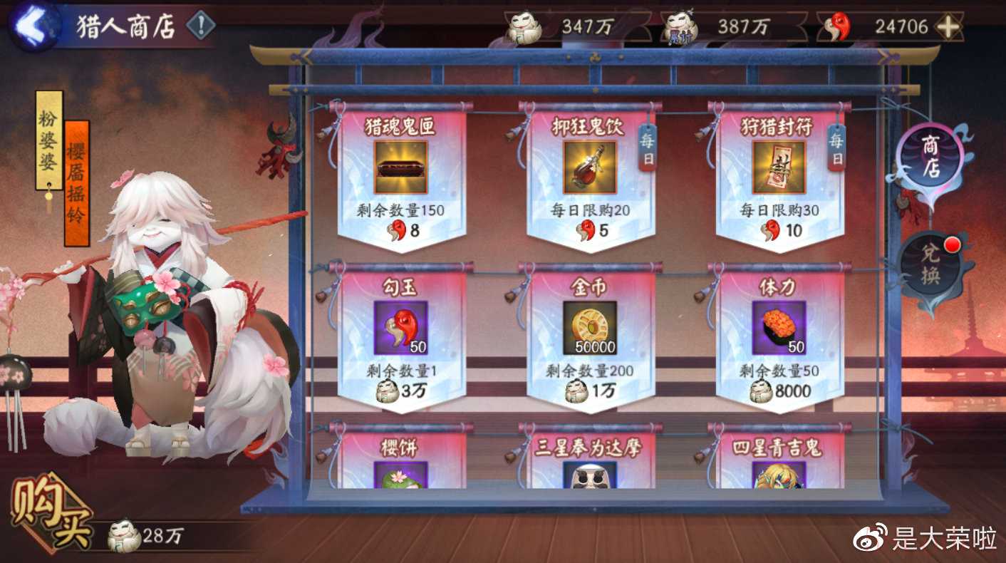 常规的蓝票、勾玉、黑蛋、高星白蛋、上万体力、修罗鬼童丸伴生插画、动态头像框以及粉婆婆·樱靥摇铃 新皮肤等奖励供获取。