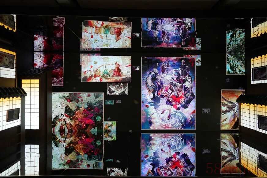 一旁的插画区,则通过环绕式的视听语言,打造了一方消弭虚拟和现实界限的空间——官方在室内通过大片的镜面陈设,配合LED屏幕上精致的动画演出,以及《阴阳师》九年以来积累的中多精美插画,让玩家得以浸入游戏世界之中。