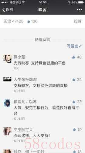 图说:映客官方公众号发布新规范,获得映客用户大力支持