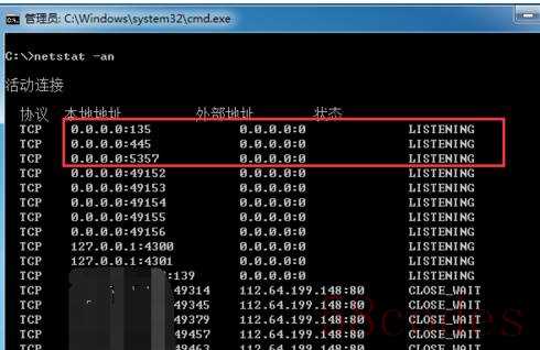 接着,可以发现当前系统开放了135、445以及5357端口,而且从状态看都处于监听状态”Listening“