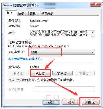 然后,找到server服务,双击进入管理控制页面。把这个服务的启动类型更改为“禁用”,服务状态更改为“停止”,最后点击应用即可。
