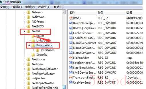 接着,依次点击注册表选项”HKEY_LOCAL_MACHINESYSTEMCurrentControlSetservicesNetBTParameters“,进入NetBT这个服务的相关注册表项。