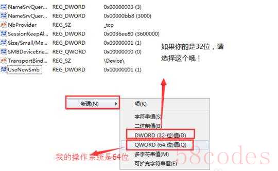 然后,在Parameters这个子项的右侧,点击鼠标右键,“新建”,“QWORD(64位)值”,然后重命名为“SMBDeviceEnabled”,再把这个子键的值改为0。