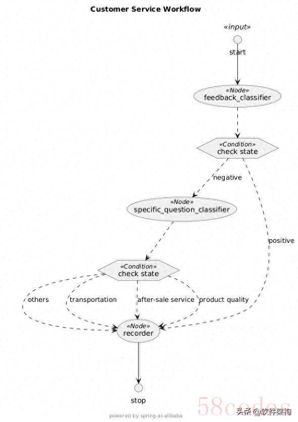 specific_question_classifier -> recorder:同样通过条件边,无论负面反馈被细分为何种类别(售后、运输、质量或其它),都汇流到 记录(recorder)节点进行统一处理;