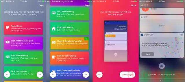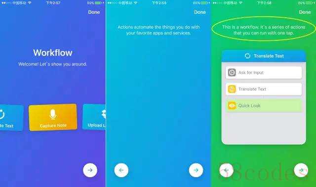 首次启动 Workflow 时,App会有一段使用教程来引导用户了解基本操作,大致就告诉大家,一个workflow的存在,可以使你一系列的常用动作(actions)仅靠一键(one tap)便实现。并且你可以将这个常用的workflow放在Widget里,使得操作更加便捷有效率。