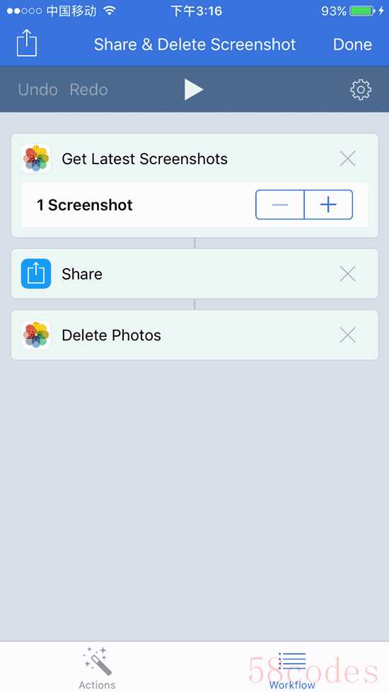 比如小编选择的系统推荐的workflow是“分享 & 删除截图(Share & Delete Screenshot)”,这个workflow分为三次动作(actions),即截图 - 分享 - 删除。添加了这个workflow之后,即可一键完成。只需点击顶部的播放按钮便可开始进行动作。