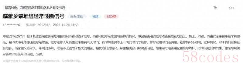收到西女士的留言后,札达县高度重视,立即指派专人认真核查。据回复,经核实,底雅乡荣堆组移动信号基站路段属于泥石流和落石多发路段,导致供电不稳信号中断,县移动公司人员已到现场对信号基站进行整改修复,目前信号已恢复正常。