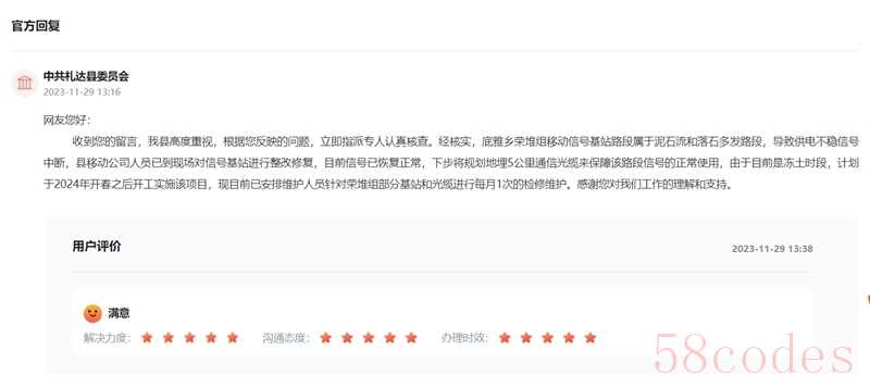 回复表示,下步,札达县将规划地埋5公里通信光缆来保障该路段信号的正常使用。由于目前是冻土时段,计划于2024年开春之后开工实施该项目,现目前已安排维护人员针对荣堆组部分基站和光缆进行每月1次的检修维护。