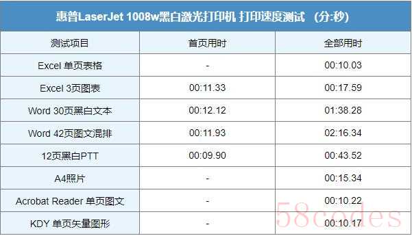 作为一款标称打印速度为20页/分钟的打印产品,我们对惠普Laser 1008w黑白激光打印机进行了标准的打印输出速度测试,结果如下: