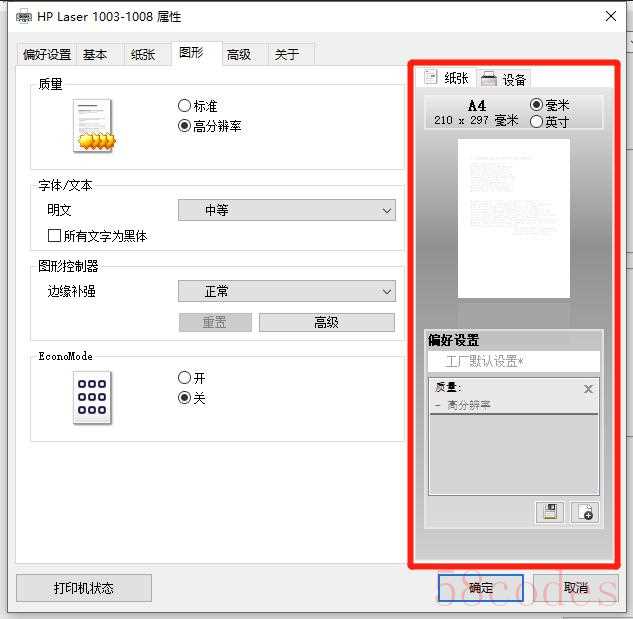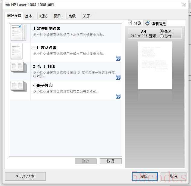 在惠普Laser 1008w黑白激光打印机的打印机首选项设置中,我们看到该产品的打印首选项中共分为五个页卡可供选择,分别是偏好设置、基本、纸张、图形、高级等,用户可根据自身需求进行设置,并在右侧预览窗口查看已设置的信息。