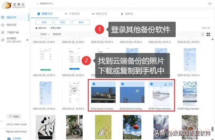 步骤:使用手机或电脑登录你常用的备份平台,找到存储照片相关的文件,选中需要的照片,下载或复制到手机。