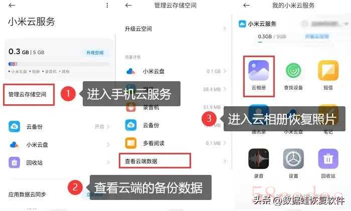 步骤:打开手机云服务,进入云相册浏览已备份的图片,恢复需要的照片。