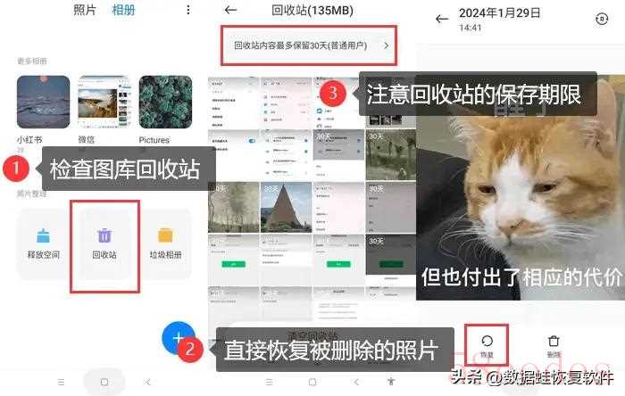手机不小心删除的照片如何找回?不得不提的就是手机自带的恢复功能了,这一般叫做【回收站】或【最近删除】,可以快速还原你刚删除的数据。
