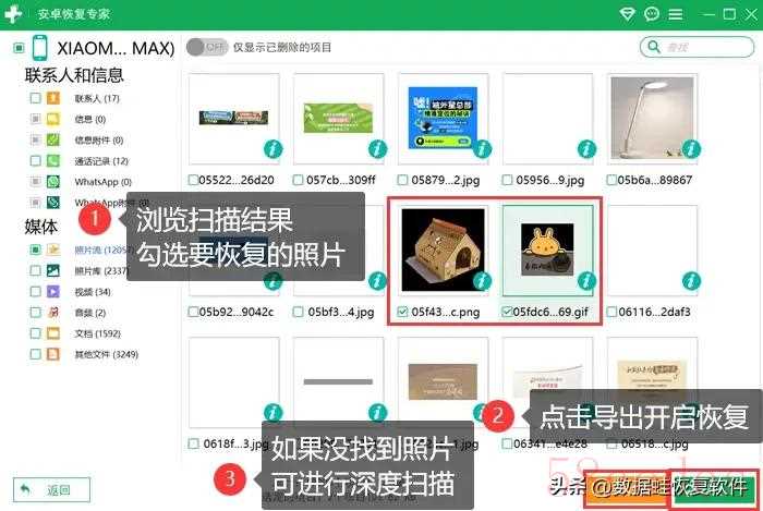 步骤3:在扫描结果中,你可以看到一系列挖掘出的照片。浏览列表中的照片,然后勾选想要找回来的那些吧。最后,只需点击【导出】,为数据选择栖身之所,就可以开启恢复。