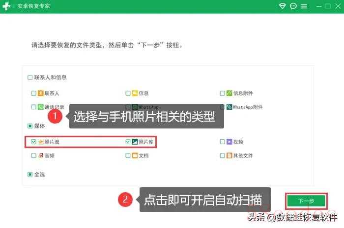 步骤2:连接稳定后,页面会自动跳转,你将在屏幕中看到各种选项。那就选择和手机照片相关的类型吧,比如【照片流】、【照片库】,再点击【下一步】,开启扫描!