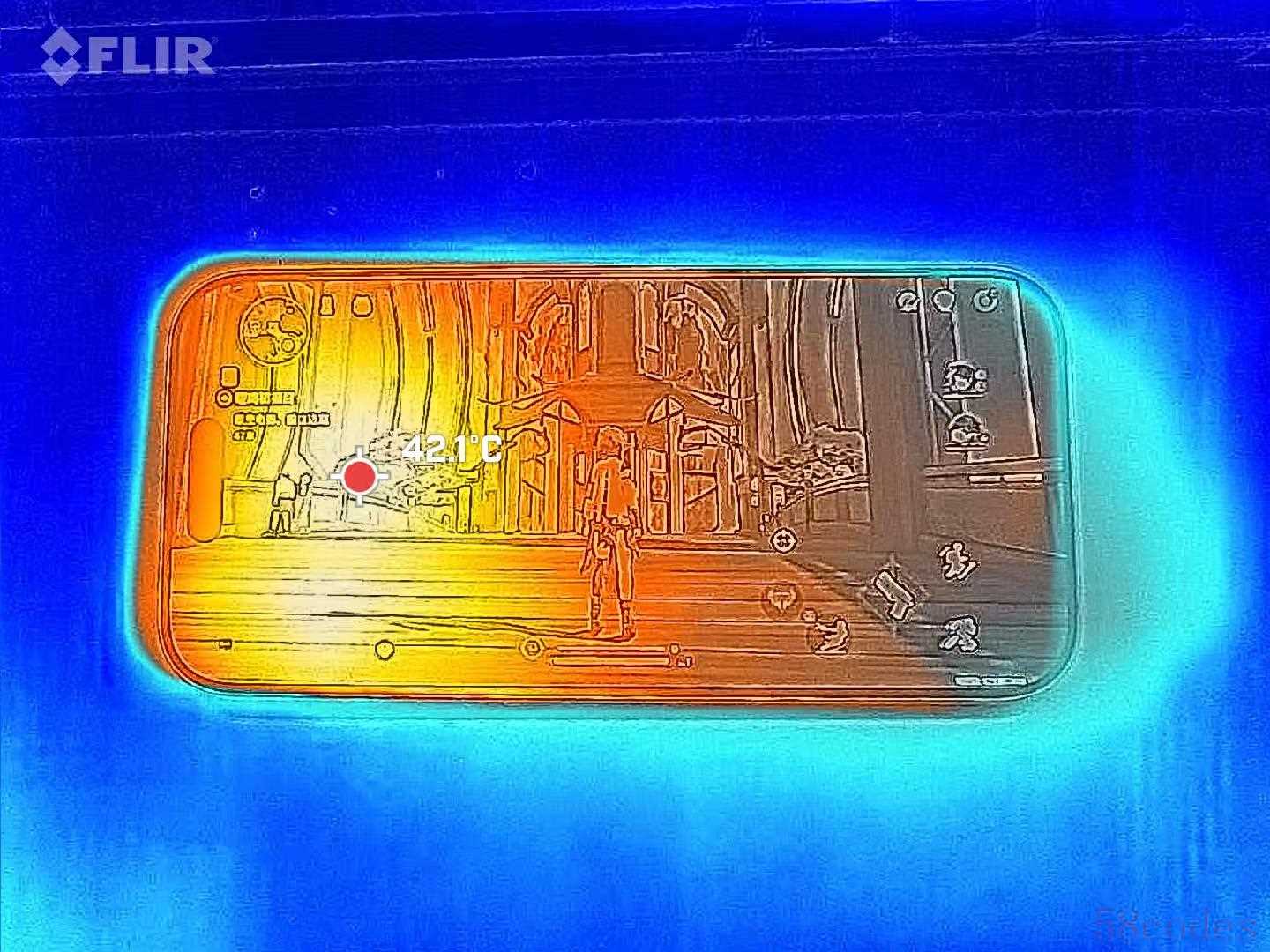 在高负载游戏半小时后,iPhone 17的正面温度来到了42°C左右,和安卓小屏旗舰相比,甚至感觉还要更加冷静一些,不过背面温度来到了46C°左右。使用热成像观察的话,不难发现机身发热集中在机身顶部,边框的散热效果居然出奇地不错。