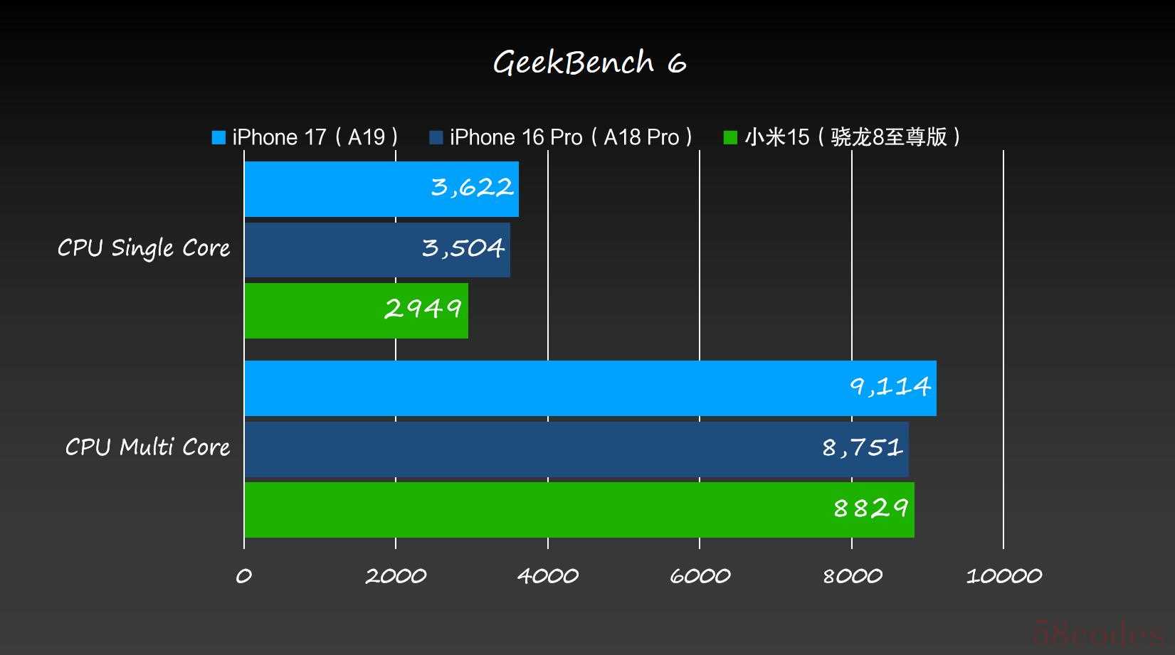iPhone 17搭载的A19芯片,在GeekBench跑分中毫无疑问地再次刷新了移动端CPU的性能记录,单核3622分,多核9114。可以说在CPU层面,苹果依旧是傲视群雄的存在。