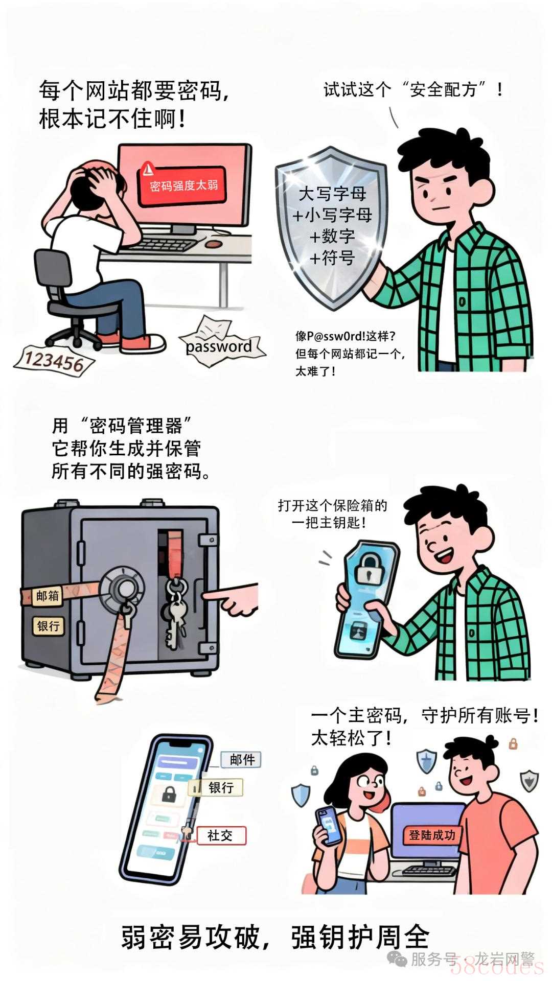 牢记:弱密坚决不再用,密码长度超12位,组合包含四元素,管理器来管密码库。
