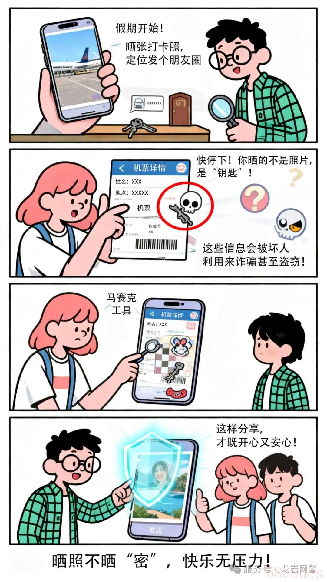 在社交媒体晒照时,隐去机票、护照、车牌、家门钥匙等敏感信息。