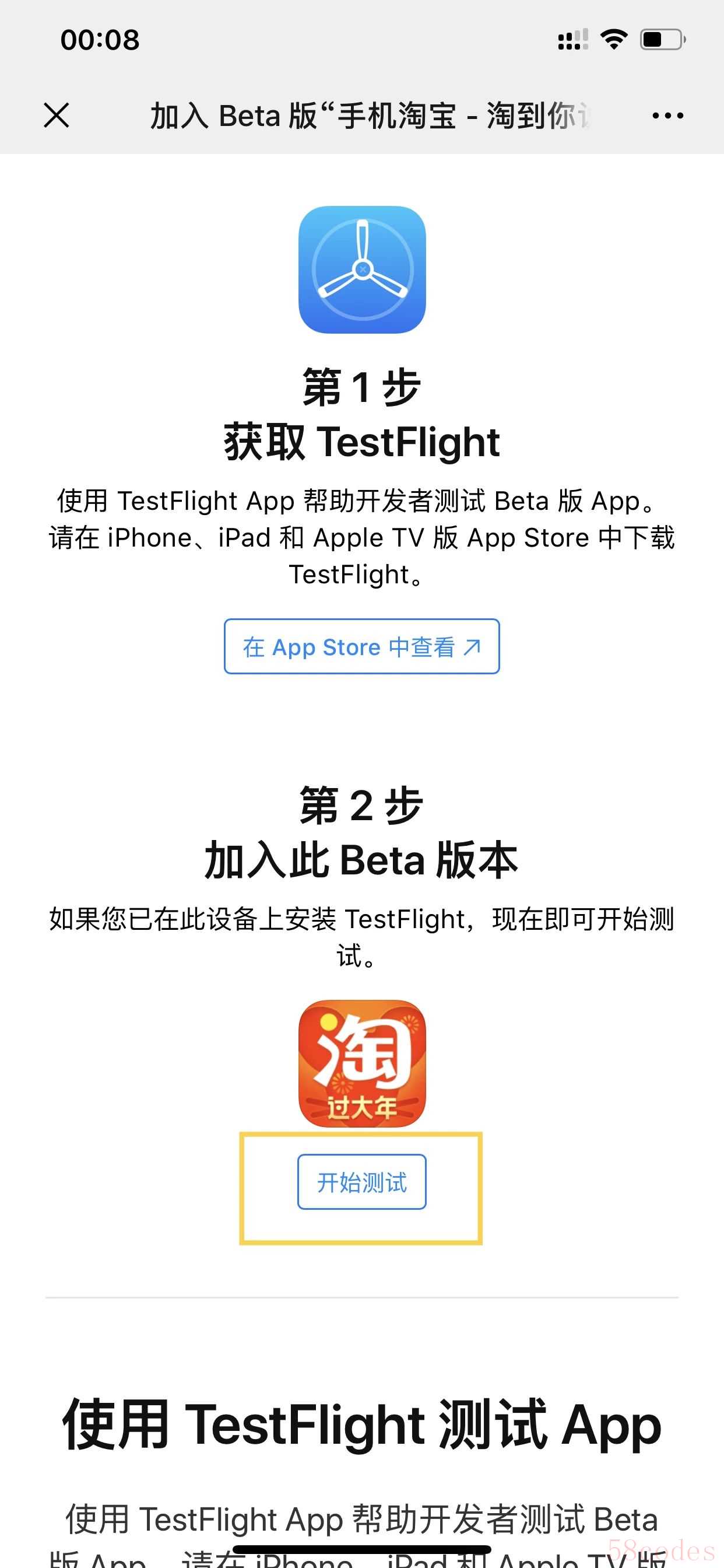 安装教程:到公众号发送「126」获取的安装链接,安装需要先在APP Store 上下载「TestFlight」软件并打开,打开链接之后点击「开始测试」按钮即可开始下载淘宝测试版了。